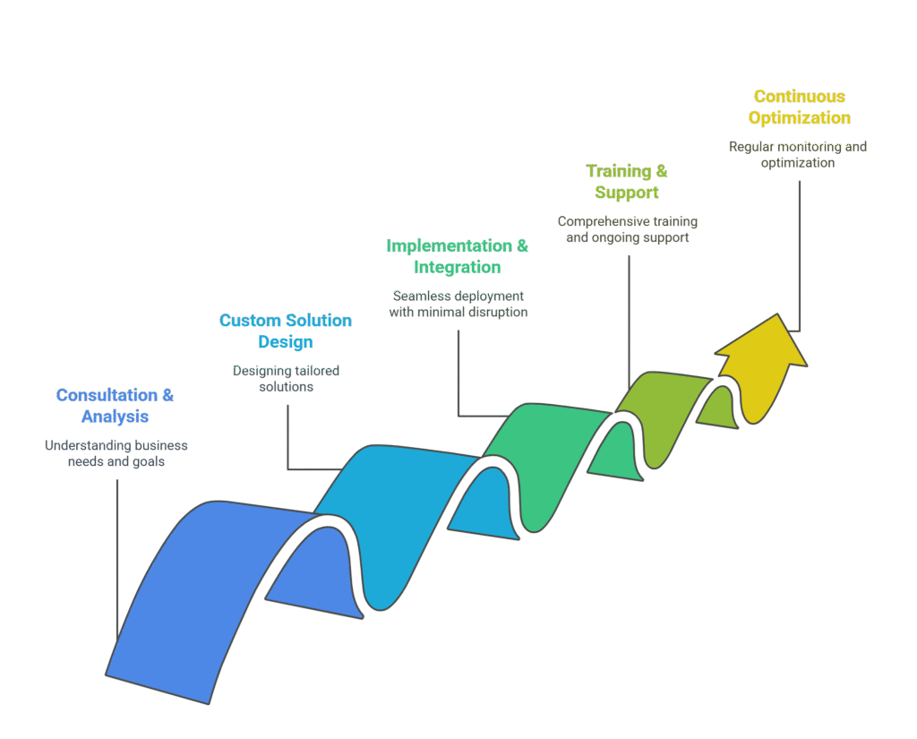 Our process starts with a detailed consultation and analysis of your current IT setup. We then design a custom solution, implement it seamlessly, train your team, and offer ongoing support and optimization.